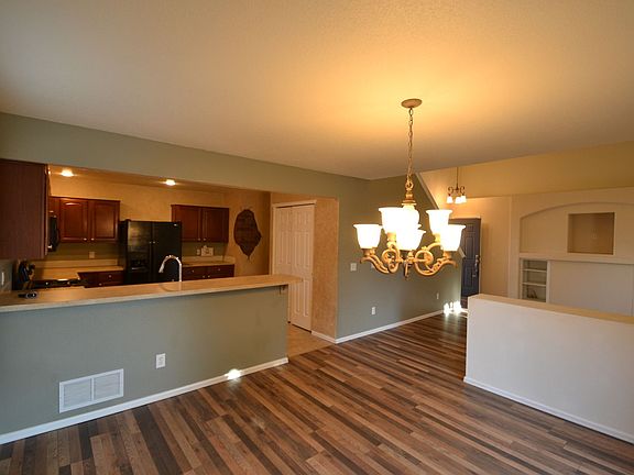Large open floorplan with new flooring on main level. Cherry cabinets and designer touches throughout. Low maintenance with sprinklers. The home has 3 bedrooms and 2 full bathrooms upstairs. There is a half baht on the main level and the basement is unfinished with hooks ups for the washer and dryer. Newer AC unit and fully fenced in yard. Large concrete patio for entertaining with breakfast bar. The home was built in 2003, located in School District 49, and is 2156 square feet.