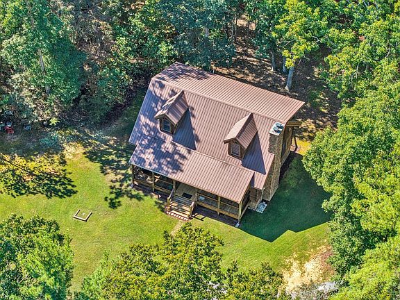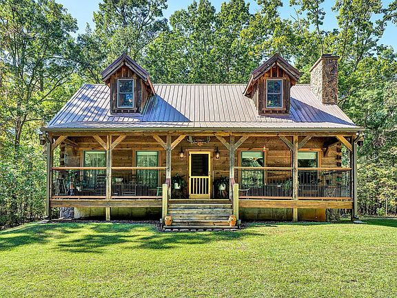 Hand-hewn log cabinStone fireplaceWooded acreageRocking chair front porchVaulted ceilingsExposed log wallsPrivate acres
