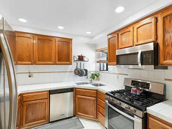 Desirable 2/2 ground floor unit offers comfort, convenience, and style in a well maintained gated community. Featuring beautiful wood flooring, a spacious Great Room/Dining Room combo with a cozy fireplace and recessed lighting. The kitchen is thoughtfully designed with a corner sink beneath a charming greenhouse window, a pass through from kitchen to living room bar. Newer stainless steel LG appliances, including a 24.9 cu. ft. French door and drawer refrigerator/freezer. Natural light fills the home, creating a bright, welcoming atmosphere. The large primary bedroom includes a walk in closet and en-suite bathroom with dual sinks. The guest bathroom features a granite countertop. Tile flooring enhances the entryway, kitchen, and both bathrooms for added durability and easy maintenance. Additional highlights include: An in-unit laundry closet with a full-size washer/dryer included. Aample storage throughout plus a private storage unit on the patio. There are two private patios, one off the primary bedroom. Upgraded A/C unit and water heater and assigned covered parking space. The community features park like grounds with grassy walkways, a swimming pool, spa, tennis/basketball courts, all with low HOA fees. Conveniently located near the freeway, shopping, and dining.