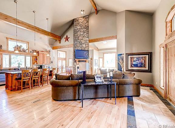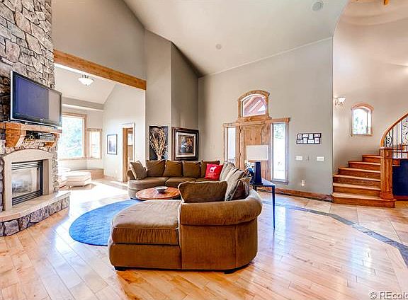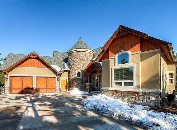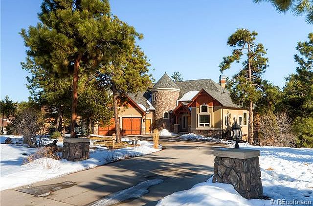 Spectacular custom two-story walk-out, nestled on a wooded lot with towering pines and complete privacy! Every detail crafted with the highest quality. Gorgeous maple floors, Alder cabinets, slab granite counters, Alder doors throughout. Great open floor plan with soaring ceilings and double sided rock fireplace! Main level bedroom plus study. Gym room or music studio. Two master suites upstairs. Secret bonus room. Finished walk-out basement with home theater room, rec room. Amazing outdoor space! Large stamped concrete patio with built in firepit. Two decks. Oversize garage with workshop and storage. Only 1 mile from Bear Dance Golf Club, home of the Colorado PGA. Truly one of a kind home!