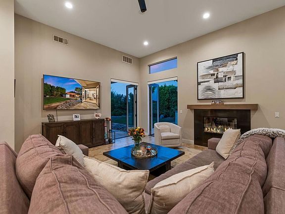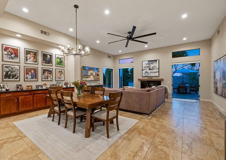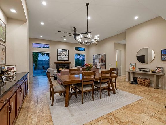 Pele Place - Palm DesertPerfectly positioned in the heart of Palm Desert, this one-of-a-kind semi-custom home blends sophistication, comfort, and modern desert style. Behind its double-door entry, soaring 12- and 10-foot ceilings and oversized tile floors create a grand sense of space. Every detail feels intentional--8-foot doors, thick baseboards, designer lighting, and French doors opening to the resort-style backyard.The open-concept living area centers around a dramatic great room with a statement fan and a stunning chandelier over the dining space. The chef's kitchen showcases granite slab counters, a custom backsplash, Bosch stainless-steel appliances, a pantry, dual sinks, and a mini wine fridge--ideal for entertaining.The primary suite is a retreat of its own with double-door entry, direct backyard access, and a spa-inspired bath featuring a free-standing soaking tub, floor-to-ceiling tile, a floating double vanity with quartz counters, and a massive walk-in shower with three shower heads.Guest bedrooms are thoughtfully placed on the opposite wing for privacy and share a beautifully appointed full bath. The garage impresses with epoxy flooring, high ceilings, and built-in cabinetry.Outside, nearly 11,000 square feet of private, cul-de-sac living awaits--complete with a custom Pebble Tec pool & spa, firepit lounge, built-in BBQ, and lush mature landscaping framed by stone decking. Modern, custom, and move-in ready--Pele Place is a true Palm Desert gem built for desert living at its finest.