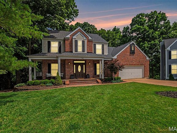In a word—GORGEOUS—perfectly describes this exceptional Flower-built home, nestled on a stunning .46-acre cul-de-sac lot in the highly sought-after subdivision. From the moment you arrive, the charming wrap-around front porch, a signature feature of the builder, invites you in. Inside, you'll fall in love with the beautiful hardwood floors that flow throughout much of the main level. The spacious, light-filled kitchen boasts 42” cabinets, center island, breakfast bar, & a separate breakfast area—ideal for both everyday living and entertaining. The kitchen opens to a magnificent hearth room with soaring cathedral ceilings and large windows, while on the other side, it adjoins a spectacular family room featuring a brick fireplace, cathedral ceiling, and custom built-in bookcases. Upstairs, you'll find four generous bedrooms, including a luxurious primary suite. The recently renovated spa-like primary bath offers the perfect retreat. The lower level offers an unfinished walkout basement ready for your personal touch. Step outside to enjoy a composite deck with an awning and ceiling fan, overlooking a private, tree-lined backyard—your own peaceful oasis. The community features a private neighborhood pool and active swim team. Castlewood State Park is less than a mile away via the neighborhood’s private back entrance, offering miles of hiking trails & breathtaking river views. All this, plus you're just minutes from your favorite local shops and restaurants.