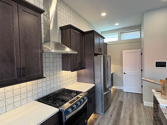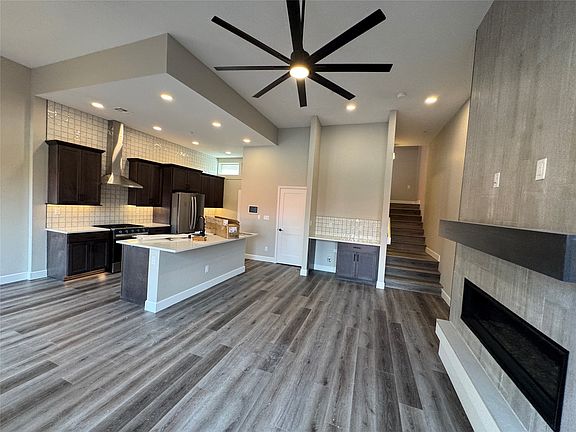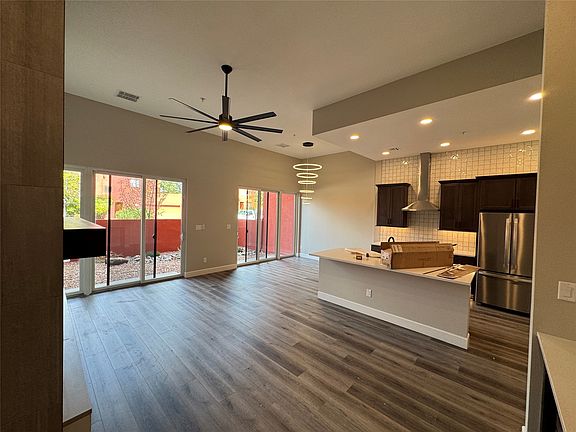 Welcome to Unit #45 at Zocalo, Santa Fe—A refined interior unit that perfectly melds luxury with comfort. As you step into the inviting foyer, you are presented with two enticing options: descend to the lower level where the expansive great room awaits, complete with modern grey toned, sophisticated brushed nickel finishes, and contemporary maple-finished flooring that radiates modern elegance. This level also houses the well-appointed kitchen and provides access to the beautifully landscaped patio, ideal for both vibrant entertainment and serene relaxation.