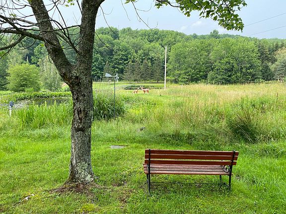 Less than five miles from the village of Franklin, up a long drive past two ponds, sits an expanded contemporary style A-frame fronting a town-maintained dirt road. It feels far, and yet fiber optic Internet is available, so you're as connected as you want to be. This has been a well-loved full time home for many years, and includes three lots totaling 22.5 acres. The upstairs is an open plan kitchen and dining area opening to the back deck, and a living room warmed by a pellet stove (easily reconnected). The master bedroom is to one side, with sliding doors to the deck and its own full bath adjacent to the separate laundry room. The other side of the house has two more bedrooms and a full bath. Downstairs is a spacious family area and office area with a super-efficient and warm Russian style tiled wood stove. There's a garage and a workshop in the lower level as well. There's electric heat, hardwood floors, and everything shows pride of ownership. Outside, several outbuildings. The two additional lots are beside and behind you, with the possibility of accessing the upper 10 acre lot with a driveway from Campbell Estates Rd. This is a property that showcases the peace and serenity of upstate life, yet the thriving arts community of Franklin is just a short drive away. Two and a half hours to the GWB. Includes 122.-2-40-- 5.52 ac w/house, 122.2-34-- 10.41 ac, 122.-2-41-- 7 ac.