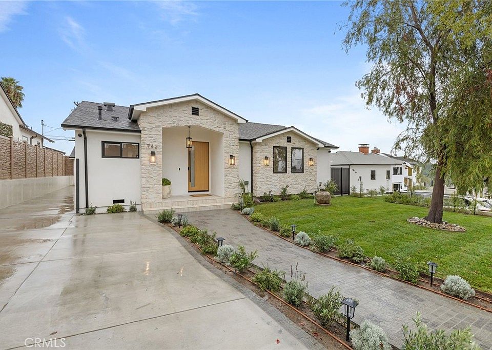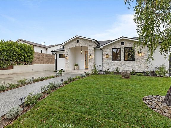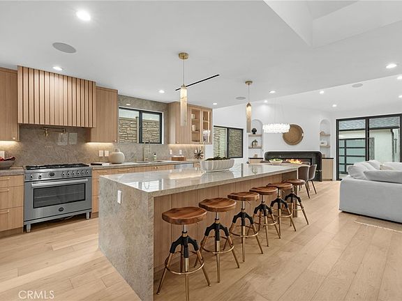 Stunning rebuilt and expanded home in the Burbank Hills showcasing exceptional design and craftsmanship throughout. A striking 8ft custom front door with light panel welcomes you into an impressive 11 ft formal entry that opens seamlessly to the showpiece kitchen. Custom white oak cabinetry, a handcrafted stove hood, glass display cabinets, and high end appliances anchor the space, complemented by a 10 ft floor center island finished in natural Allure quartz with a waterfall edge and seating for six. The expansive living and dining areas feature soaring ceilings with walls of windows and doors which flood the space with natural light. The generous gathering space opens to the outdoors, and features a beautiful new gas fireplace with curved stone mantel, built in bookshelves, and custom cabinetry- perfect for both entertaining and everyday comfort. The conveniently located powder room off of the living area is a true showstopper with portolan limewash. The home offers three bedroom suites, including a luxurious primary retreat with a spa-inspired bathroom. Enjoy a walk in shower with soaking tub, 72 inch vanity, smart toilet, and a modern LED lit walk in closet. The additional bedroom suites each include their own private bathrooms, custom closets and high ceilings. A walk-in laundry room with a sink is located adjacent to the kitchen. The designer landscaped grounds are not to be missed- featuring a Weber BBQ, a concrete fire pit, and a tranquil water feature that enhances the curb appeal and outdoor living experience.There is a versatile two car garage that provides the ideal opportunity for a home office, studio or family game room. An exceptional property you truly must see!