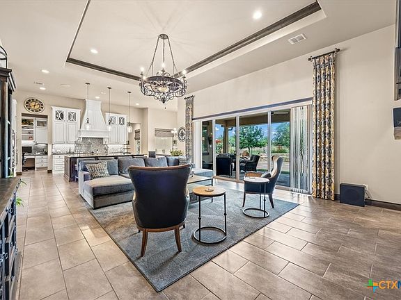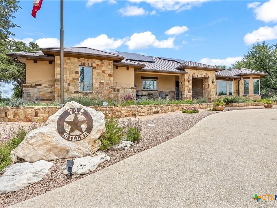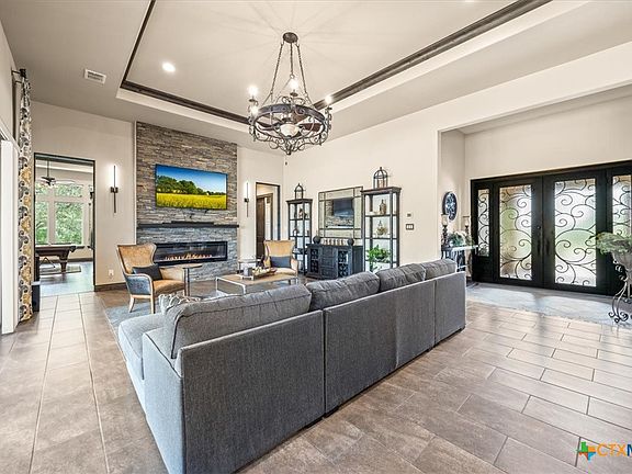 This phenomenal Hill Country Home has it all!! As you walk into this dream home through the double leaded glass doors..you will experience the openness of the main living area and all the windows overlooking the fabulous outdoor living area complete with a Hot Tub, fire pit area, majestic landscaping and a putting green, enclosed with wrought iron fencing. Your gourmet kitchen has a HUGE oversized island, Induction cooktop, double door oven, stainless farmhouse sink and a refrigerator with a built in Keurig coffee maker. The oversized walk through pantry has Tons of shelves & built in and an office area w/built in desk and cabinets. The Utility room is also oversized with 2 closets, and a built in wrapping paper station w/another desk area & Tons of built-ins. Living Room is open, light & bright! Complete w/a gorgeous electric fireplace w/mantle. The Owner's retreat comes with a coffee/wine bar area as you enter the suite. Bedroom comes w/an electric fireplace w/mantle & a sitting room/study off the bedroom. The en-suite bath area comes w/a walk in shower & a heat lamp to get warm as you step out, jetted tub, split vanities & HUGE walk in closet w/custom built-ins including special cabinets for your jewelry. The Flex room is a FABULOUS Game Room & Media Room. Game room comes with a built in bar area and a pool table. The Media Room w/barn doors comes complete with theater set up, speaker, projector, & screen! Outside you have an oversized 3-car garage w/work bench area. There is a 10x10 insulated Garden Shed w/Electric. Home has a water softener & a 5 filter water filter system. (Most of furniture is negotiable including lawnmower. The home can be turnkey .. just move in!!) This beautifully landscaped home w/a circular driveway and located on a cul-de-sac is perfect from head to toe! Don't forget the solar panels for little to nothing on your electric bill. Home has water views when lake is up. This gated section is surrounded by water on 3 sides.