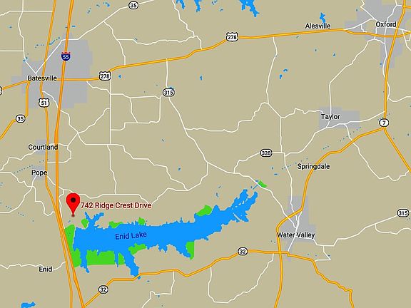 Offering a One-Year Home Warranty & $1,500 in Buyer Closing Costs! Enid Lake Get-Away! (NOT a mobile home, by the way!) Corner Lot with Water View! This cute little house sits on the corner of Mid Valley Boulevard and Ridgecrest Drive in Enid Shores. The metal roof was replaced in 2014, and the wrap-around porch has a beautiful view of one of the lakes within the subdivision! There are 2 window units for cooling, and propane wall heaters provide heat in the winter. The home sits on over an acre and a half, so there's plenty of room to enjoy the outdoors. Wallace Creek Recreation Area is just a couple of minutes away, so you can be on the water in no time! Stove & Refrigerator Included ~ Entergy bill averages about $75 per month, which includes a $15 outdoor security light fee. The propane costs about $300 per year, & the water is with Lipe Waterworks. The septic has JUST been inspected by the Panola County Land Development Office, so it's ready to go! Taxes are zero with the current over-65 homestead exemption, but would be $590 without that.