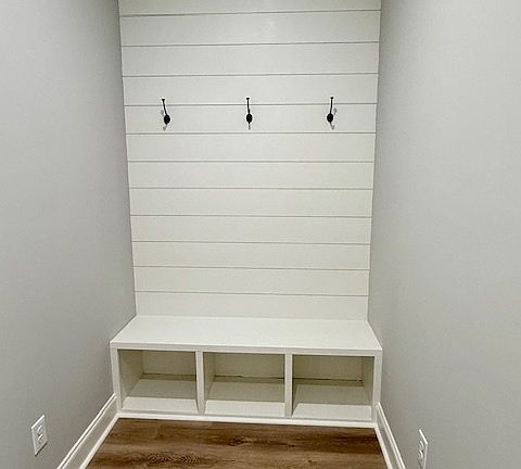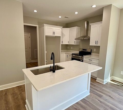 Shaker-style cabinetsSolid surface countertopsStylish black fixturesDurable lvp flooringPlush carpet