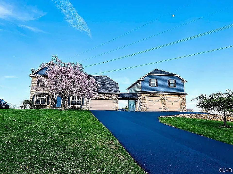 Stunning custom built home with two car attached garage & views for miles! 3.8 Acres! Calling all car enthusiasts, contractors or hobbyists! There is an elaborate detached two car oversized garage with heated workshop, finished second floor with central air/heat, that boasts a huge entertaining area, Juliet deck, powder room, surround sound speakers, fireplace inserts & seating area! Well maintained throughout! New carpet, paint & refinished hardwood floors! Country living! Two story foyer welcomes you with an adjacent dining room & office! Cozy family room with stone gas fireplace, tv & views of the private large yard! Spacious kitchen with cherry cabinetry, stainless steel appliances, granite counters, under cabinet lighting & two tier eat at island! Breakfast nook provides additional entertaining space with access through the glass door to rear patio & hot tub! First floor powder room & laundry room! Primary bedroom suite boasts tray ceiling, walk in closet & modern full bath with tile shower, custom double vanity with granite tops! Three additional nice sized bedrooms with ceiling fans, new flooring & paint! Full hall bath with soaking tub/shower complete the second floor! Finished basement features a wet bar, tv/surround sound, full bath, flex space & additional storage area! Spend your summers relaxing within the above ground pool & new composite deck! Hot tub, Washer, Dryer & Refrigerator in kitchen remain! Christmas light package on front of home!This home is a dream!