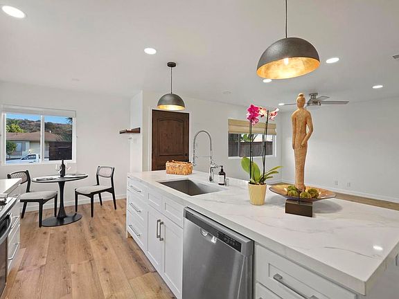 Price reduction and NO HOA FEES. Welcome to a wonderful mid-century modern style twin home with two bedrooms and one bathroom in the highly sought after community of Pacific Serena in Encinitas. This open concept kitchen features quartz countertops, stainless steel appliances, a range hood, glass inset cabinetry, soft close drawers and a beautiful large island. Additional upgrades include air conditioning unit, luxury vinyl plank flooring, recessed can lighting throughout, ceiling fans, dual paned windows, closet organizers and sliding glass doors for indoor/outdoor living. Upon entering the private backyard with a large grassy lawn, guests will enjoy relaxing under the steel and wood pergola, gardening in the planter boxes and a convenient outdoor shower. The designer front yard with gorgeous plants and space to entertain with privacy and evening lighting. The private fenced and gated patio provides outdoor living and entertaining space, professionally landscaped, Ring security cameras at garage, front door and backyard, Rachio and Hubspace app-based irrigation and lighting systems. Fully irrigated fruit trees - nectarine, strawberry fig, apricot. Nectaplum, blood orange, Meyer lemon, kaffir lime, and pomegranate. Three Veggie raised beds with drip system. Don't miss the finished-out garage and designer stenciled flooring which could easily be used as an office, craft room, playroom, or exercise room. 220 volts hook up ready for a future Hot Tub. Enjoy ocean breezes and sunsets just 1.5 miles to the beach, walking distance to Encinitas Ranch Trails and located within top rated schools in the San Dieguito and Encinitas Union School Districts. NO HOA fees or Mello Roos. Located near the famous Moonlight Beach and San Diego Botanical Garden & close proximity to unique shops, top rated restaurants and gorgeous beaches make this the perfect place to call home!