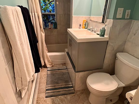 Modern bathModern eat-in kitchenDining roomCeiling fanHardwood floorsElectric rangeHigh ceilings