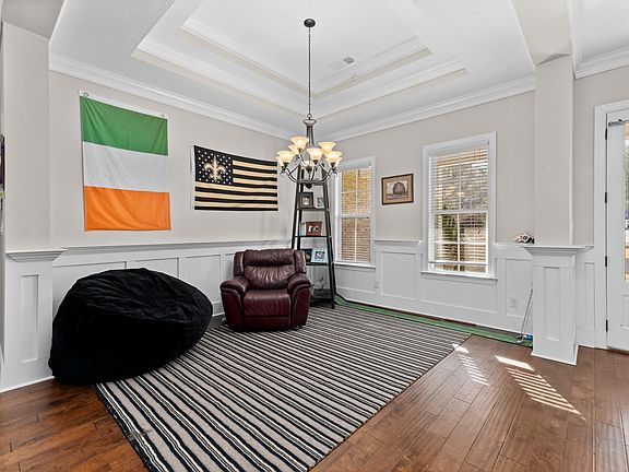 As you enter the home, you'll notice the meticulous details, including recessed lighting, trey ceilings, and custom moldings. The focal point is the striking stacked stone/ship lap gas log heated fireplace, setting the tone for a warm and welcoming ambiance. The bright and open floor plan showcases beautiful hardwood floors, creating an inviting atmosphere.