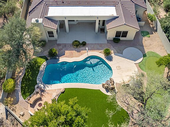 This exquisite home with its extensive array of upgrades, is certain to impress. Just over 3100sqft of single level living, sitting on 4/5ths of an acre with low maintenance desert landscaping and bordered by true Sonoran desert. Upon entry, the soaring 13ft ceilings add to the expansive feel. Porcelain tile and wood flooring throughout allow for ease of maintenance and a cooling feel to the home. The Kitchen features top of the line Dacor 5 burner gas cooktop, GE Profile double ovens and gorgeous Mascalzone granite countertops. The primary bedroom is extraordinarily generous in size and its remodeled bathroom is truly stunning. From the Alaska White granite counters to the stand-alone soaking tub, the herringbone laid tile flooring to the Toto Toilet and Bidet, luxury abounds. The backyard is a true highlight. The newly lined and tiled pebbletec pool sparkles along with both a Kiva fireplace and 4 hole putting green. The fire pit with banco seating is another of the 6 separate seating areas. North facing and bordered by lush natural area, this backyard oasis also has a large covered area, perfect for outdoor dining. The 3 car garage has epoxy flooring and plenty of space for additional storage. New Roof 2020! Please visit the documents tab for a full list of extensive features and upgrades.
