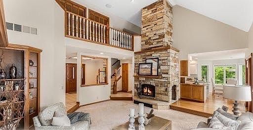 Experience true lakefront living with 378 feet of private shoreline and 1.14 acres of secluded residence. This updated 3-BR, 4-BA home offers breathtaking views and a peaceful retreat on fully recreational Long Lake. Soak in unforgettable sunsets from the expansive deck or from the private balcony off the upstairs bedroom. The large yard offers plenty of grassy space for entertaining, relaxing, or enjoying games with friends and family. Inside, the main level features soaring vaulted ceilings with impressive stone fireplace, an updated kitchen with stone counters w informal eating area, a formal dining room, and a spacious primary suite with generous closets & ensuite and direct access to the deck and lower level hot tub room (or close off the stairway to easily add BR). Upstairs, you'll find 2 additional bedrooms and a full bath. At the same time, the walkout lower level includes a cozy family room, office space, and a versatile workshop that could easily convert to a 4th or 5th bedroom. Need more space for guests? Untapped potential and ready to expand to a 5BR/5BA layout and add over 1,000 sq ft, including space for a lower-level kitchen or bar. This home has it all! Lakeside living at its finest—private, picturesque, and packed with potential!