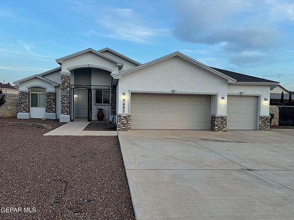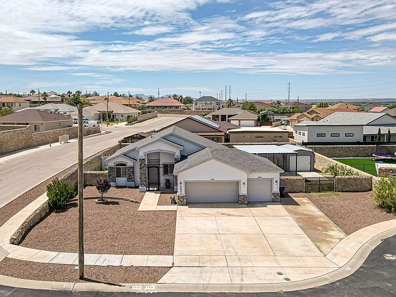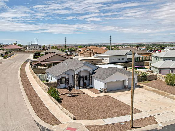 Priced to Sell!! Located in one of El Paso's unique & most desired neighborhoods, conveniently located within minutes from 2 of El Paso's busiest entertainment areas The Outlet Mall & WestTowne Market Place with EZ access to Highway. Built in 2019, You get 4 beautiful Bedrooms, One Room can be an Office for remote work, Open Concept Living Dining & Kitchen. Gorgeous Tile design and tall Base Boards. The Kitchen is eye candy!!! equipped with Stainless Steel Appliances, BIG Pantry, Custom ''Big Door'' Cabinets, space for an extra WIDE Refrigerator if needed. A very long Granite Island that can seat comfortably a multitude of people, and set a feast as well. Stone Backsplash & a cornered Sink ''Triple Car'' Garage has ample space plus also has overhead wraparound garage storage shelving & a utility sink. RV Parking Galore... plus a side Gate. A Metal Building with rollup Door, ext 220 outlet. Super high Rock Walls. Outdoor space is endless. This HUGE!! LOT measures .333 acres which is 13,847 in sq ft of Land
