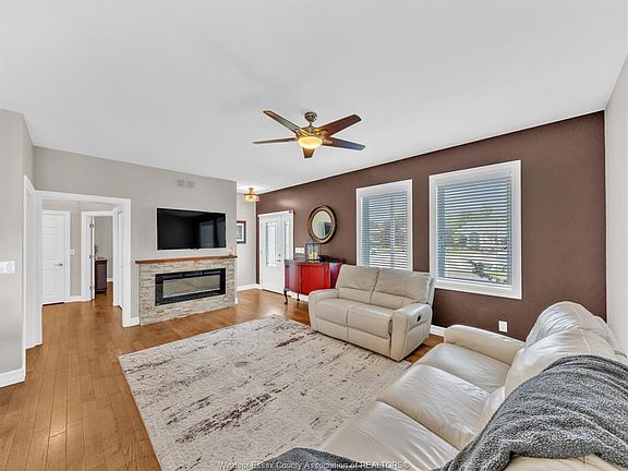 Welcome to this immaculate 9-year-new home, designed for comfort, efficiency, and low-maintenance living. Set on a beautifully landscaped, fully fenced lot (2022) with no rear neighbours, it offers ample parking, including RV space for even the largest trailers. Inside, enjoy 9-foot ceilings, a custom kitchen (2020), main floor laundry, and a fully finished basement with in-floor heating and wet bar- perfect for entertaining. With 3 bedrooms, 3 bathrooms, all 6 appliances included, and a lifetime window warranty, this home is truly move-in ready. Built for durability, it features steel roofs on both the home and two 24' x 24' garages, both fully insulated, heated, and boasting cathedral ceilings. A large attached storage area adds even more functionality. Additional perks include fiber optic internet, natural gas BBQ hookup, owned hot water tanks, and a prime location just off Hwy 401 and under 20 minutes to Windsor. This home is the full package-don't miss it!