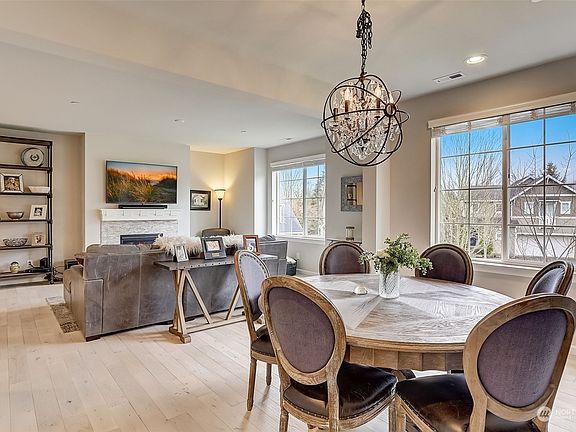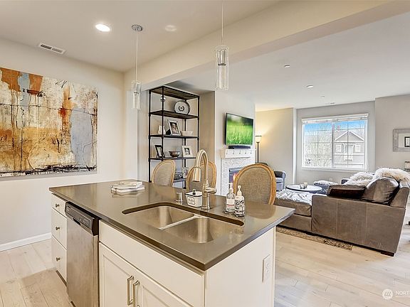 This might be the sunniest & brightest townhome in all of Snoqualmie Ridge. After parking in your attached garage you come up the stairs to a top floor corner home with windows on 3 sides and real wood floors. The home looks out over a lovely open grass area. More privacy & nature than you might expect. Built in 2015 this home still feels like new. Enjoy your open kitchen with white cabinets & stainless steel appliances & a beautiful open floorplan. Enjoy the oversized primary bedroom with large bathroom & walk in shower. Full-size side by side washer & dryer are located in a utility room. Plenty of super easy on street parking for guests & it's short walk to shops & food. Easy I90 commute. Great Snoqualmie Valley Schools. No rental cap.