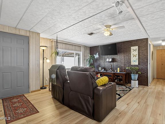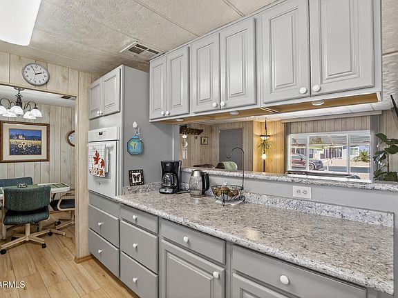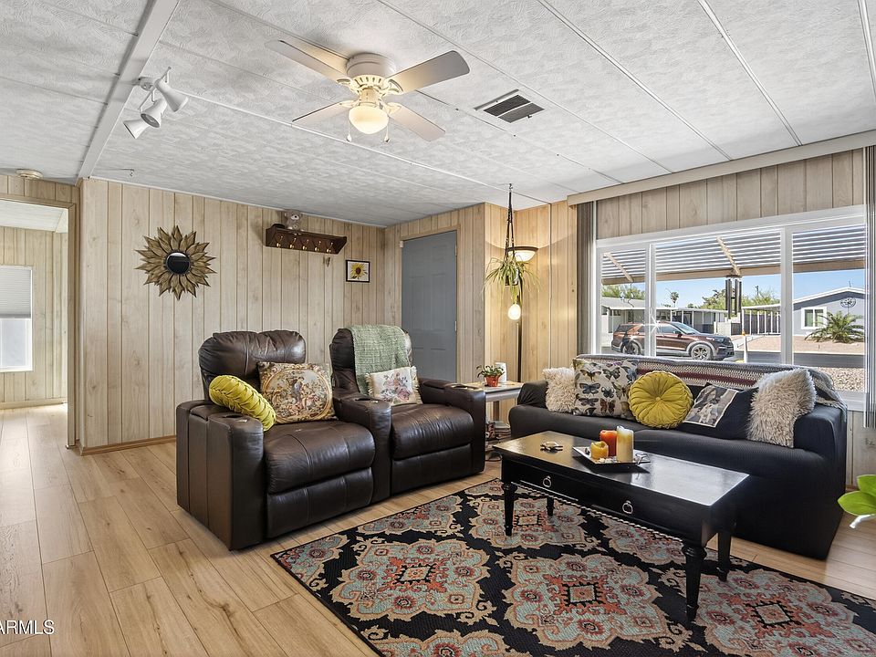 This just might be the one! Very well maintained and updated doublewide in the premier Mesa East subdivision. Uniquely positioned on the lot for North/South exposure. Spacious covered patio, extensive paver work, front and back. Bright Arizona room with 2 sliders and window unit.
