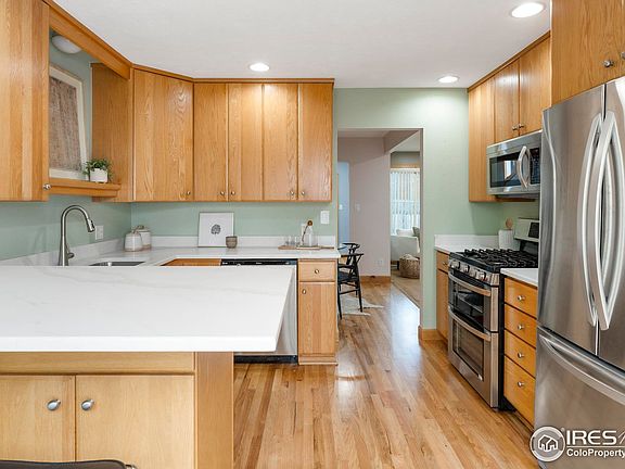 Perfectly situated near the Boulder Country Club and open space, this Flintlock townhome presents a true lock-and-leave lifestyle in a sought-after location with heated driveway and heated front sidewalk. A well-equipped kitchen welcomes with quartz countertops and high-quality appliances including a double oven. The main level is anchored by an inviting living area with a gas fireplace, flowing into a sun-filled flex room ideal for an office or lounge. Upstairs, three spacious bedrooms each feature ceiling fans, with the primary suite offering a vibrantly renovated bath. Additional updates include newer windows (2015) a fully remodeled second-floor bath, refinished wood flooring and a newer roof (2019) with Level 4 impact resistance. An attached two-car garage features epoxy flooring, storage cabinets, a workbench and a utility sink. Private enclosed courtyard entrance and a paved back patio with irrigated raised flower beds. It is a perfect space for entertaining, grilling, relaxing or gardening. Just blocks from nature trails and recreation, this home combines refined convenience and versatility.