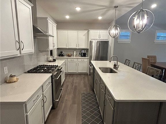 Lovely custom home by Payne & Payne in cluster community of Canyon Lakes. Open floor plan, spacious chef's kitchen featuring stainless steel appliances, gorgeous quartz counter tops, huge island with breakfast counter seating, ample soft close shaker style cabinetry and drawers, large walk-in pantry with built-in shelving, two beautiful pendant accent lights, extra space for highboy/chest, adjoining dining with extra seating and family room featuring motorized window blinds, gas logs fireplace with rough sawn wood mantel and TV. Wonderful first floor master suite with motorized window blinds, vaulted ceiling, wall of windows, view of babbling brook out back, designer ceiling fan/light, two walk-in closets with built-ins, shelves and hanging, master bathroom showcases double vanity sinks, quartz counter-top, sizable tile shower with frameless glass surround & door, private toilet room, linen/storage closet, adjacent hallway laundry room with sink and cabinet storage. The switch back staircase for access upstairs has wood post, railing and rough iron balusters, featuring two generous sized bedrooms, each with walk-in closet, ceiling fan/light, shared full bathroom with tub/shower, quartz counter and tile floor. Basement is wide open, spacious and ready for activity-- entertainment space, exercise or rec room are among the array of options, plus there is a private finished office large enough for two desks and other furnishings, full bathroom with quartz counter, full sized shower, frameless glass surround/door and artistic tiled floor. This delightful home also has an attractive deck off the family room with composite decking & railing overlooking the freshly landscaped backyard and country creek winding through the wooded vista. The finishes are timeless and fresh with a modern look and warming appeal. All rooms have custom plantation shutters window treatments along with many other add-ons by the current owners. Do yourself a favor and come check out your new home!