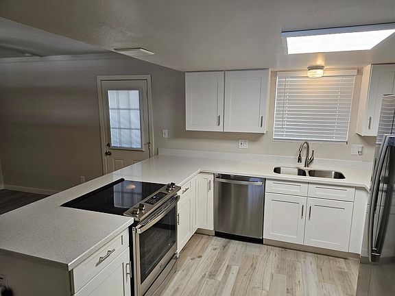 This Home Has had a complete remodel in 2023. New AC, new white shaker cabinets, quartz counters, new plank tile flooring throughout, new paint inside and outside, both bathrooms remodeled with decorator select tile showers, new light fixtures and fans, new plumbing fixtures, fresh landscape, new block bence with 10' rv gate, Large Private Back Yard, Rv Parking On Side Of Home.