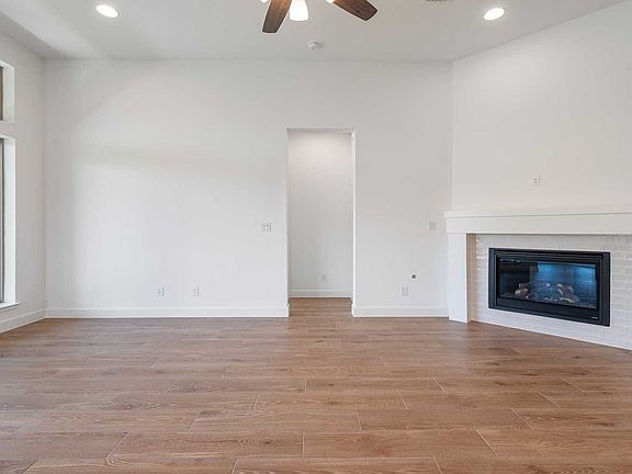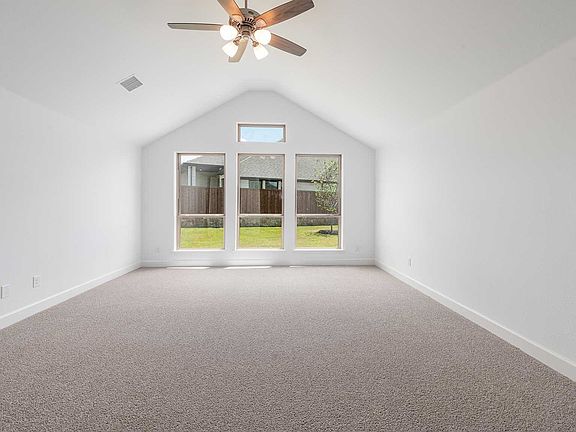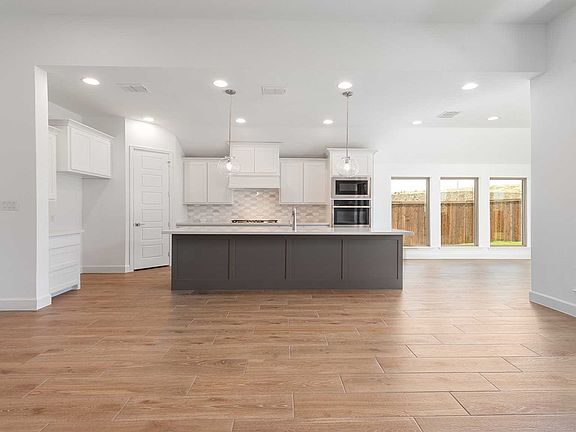 Home office with French doors set at entry with 12-foot ceiling. Coffered extended entry leads to open family room, kitchen and dining area. Family room features a cast stone fireplace and wall of windows. Kitchen features corner walk-in pantry and generous island with built-in seating space. Primary bedroom highlights 12-foot ceiling and wall of windows. Double doors lead to primary bath with dual vanities, freestanding tub and separate glass-enclosed shower with separate walk-in closets. A guest suite with private bath adds to this one-story design. Covered backyard patio. Mud room off three-car garage.