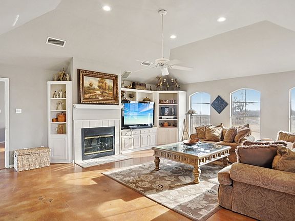 Private 5-acre multigenerational property just 15 minutes from Denton, offering space, privacy, and recent updates throughout. This three-story farmhouse-style home has two primary suites and expansive living areas designed for large families. High ceilings and abundant natural light highlight two living rooms joined by a double-sided fireplace, creating a warm, open feel. The kitchen is generous with counter space and a built-in