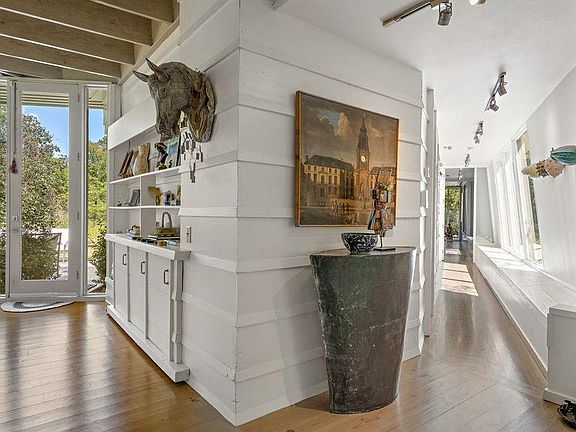 Chic Mid Century Modern, “River Bend”, designed by Phillip Roach on Military Rd acreage minutes from Downtown Cov. Spectacular glass walls overlooking landscaped vistas of flowering plants with scenic views of the Lil Bogue Falaya River. Floor to ceiling windows, fireplace & river views, Primary Suite w ofc, marble bath and covered patio, gourmet kit opens to easy family rm w, Din rm & living rm overlooking potted garden, 495 sf detached art studio. Gated 2.38 acre property. A peaceful & serene environment!