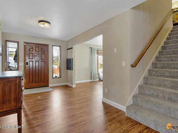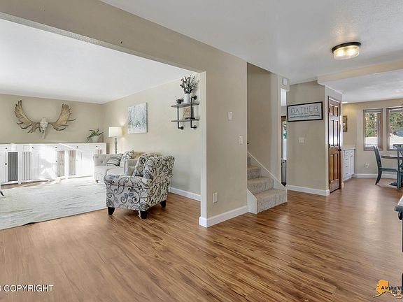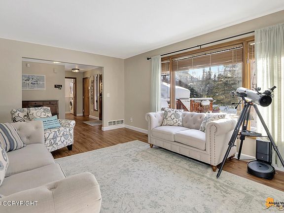 This fantastic home sits on over a half acre lot featuring professional landscaping and sprawling lawns. The property offers privacy, pull through and designated RV parking, and that's before you walk in the door! Natural light radiates throughout the entire home. The main level boasts an open concept kitchen with all new appliances, cabinet refurbishment and granite countertops; living andfamily room, dining nook, formal dining room (or home office, etc.), half bath and laundry. Primary Suite + 2 secondary bedrooms and additional bathroom upstairs. Fully finished basement has the fourth bedroom, full bathroom, large home theater, as well as a flex room perfect for a home gym, library, playroom, you name it! Garage has separate access into basement which also provides MIL or rental unit potential! This home is the best of what Anchorage has to offer! Additional Noteworthy Features: Updated LVP flooring throughout Main Floor and Basement New Carpet upstairs installed in 2022 All Appliances replaced and Cabinet remodel completed in 2022 100 mile/hour Wind Proof Roof installed by previous owners Decorative Windows in each upstairs bedroom. Trex Decking Updated Bathrooms throughout Updated lighting throughout Reverse Osmosis Water System installed 2022 Google Home C02 and Smoke detectors throughout Dog Door from main floor into designated Dog Run Costco Playset in Backyard