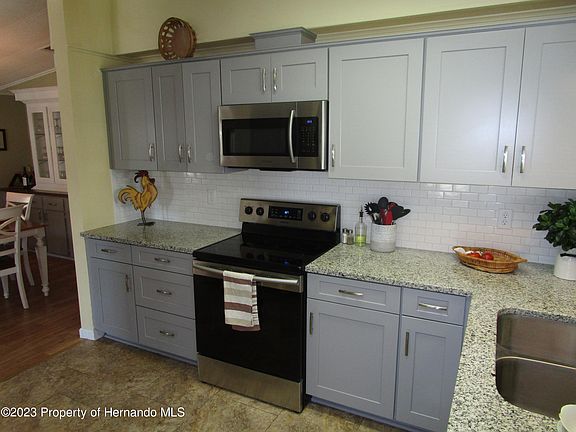 Absolutely beautiful 2 bedroom 2 bath on a corner lot. Well landscaped corner lot with mature shrubs and cement edging surrounding the property. Kitchen has gray shaker cabinets new in 2020 with soft close doors and drawers, granite counters with white subway tile backsplash Range , microwave and Refrigerator replaced in 2018, washer and dryer in 2019. New air conditioner in 2021, new roof in 2016. Lots of other upgrades and lots of beautiful furniture that will stay . Come be part of a great retirement and golf community at Brookridge.