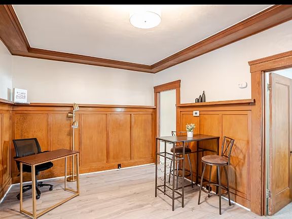This charming one-bedroom apartment features a spacious, open layout with a large dining and study area, perfect for relaxation and productivity. Adorned with elegant redwood trim and wainscoting, the interior exudes warmth and classic style. The expansive kitchen is flooded with natural light, making it a delightful space for cooking and entertaining. A perfect blend of comfort, style, and functionality.