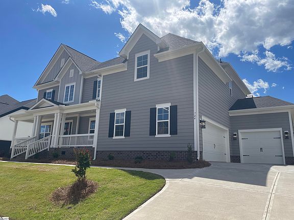 Welcome to the Silverado, an elegant craftsman-style home featuring painted smart siding and brick accents, 2-car side entry garage plus a carriage garage, and 9ft ceilings throughout the 1st and 2nd floor. Off the foyer is a living room with vaulted ceilings plus a formal dining room. The Kitchen features glacier 42" cabinets, quartzite countertops, tile backsplash, soft close doors & drawers, stainless farmhouse sink, GE stainless steel appliances with 36" cooktop with 36" professional hood plus a wall oven and microwave, and a hidden double trash pullout. Family room features a center gas fireplace and built-ins. Convenient mudroom at garage entry with built-in drop zone, plus a first-floor guest suite with private bath, featuring dove cabinets and tiled flooring, tiled steel bathtub and quartz countertops. Upstairs, the HUGE Premier Suite has a tray ceiling, spacious walk-in closet, plus a large bathroom with a tray ceiling, double vanities with quartz countertops, tiled shower and soaking tub, glacier cabinets & tiled flooring. Two secondary bedrooms feature a conjoined bathroom and WICS. Secondary bath boasts painted cabinetry, quartz countertops, and tiled steel bathtubs. All bedrooms are nicely sized with walk-in closets. Large rec room! Hardwood floors throughout the main living space on the floor, and second floor hallway, with oak trads on the stairs and painted square balusters. Tile in the laundry room with a base cabinet and sink. This beautiful community is conveniently located just minutes from downtown Greer, GSP International, Greenville and Spartanburg. River Reserve offers easy access to all the desired locations for shopping, dining, parks, and hospitals. Located in the acclaimed Riverside School District, and within minutes from 1-85.
