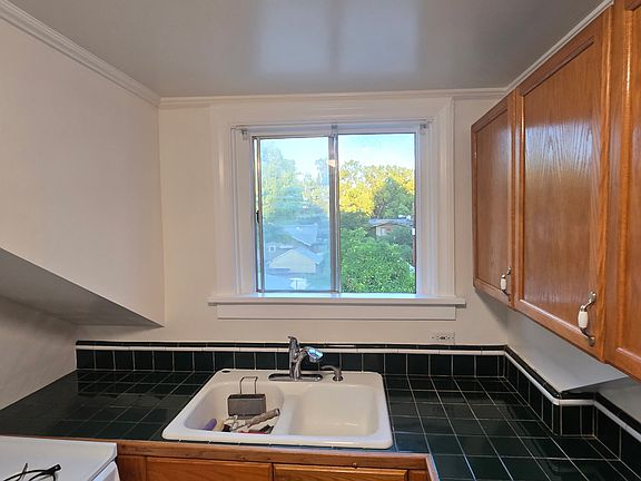 The kitchen includes a fridge and stove, and the building offers 2 coin-operated washers and dryers for your convenience. Parking is a private 1-car garage on the left side and space for an additional car behind it.