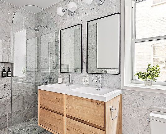 Both of the nicely sized primary bedrooms feature an en-suite spa bath, complete with Italian marble floor and wall tiles, and a large walk-in shower. The second bath in each apartment offers a soaking tub and chic terrazzo-like flooring. Additional highlights include an in-unit washer/dryer, multi-zoned heating and cooling, and designer lighting, all complemented by elegant brushed white oak engineered flooring.