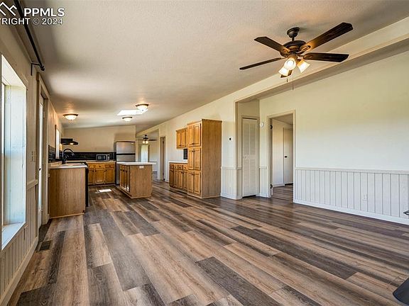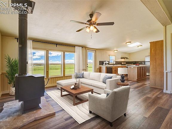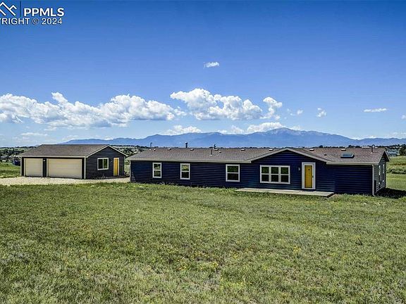 Welcome home to this ranch home boasting newer modern upgrades throughout. Nestled on 4+acres of rolling meadow w/creek. Offering unobstructed panoramic views of Pikes Peak. Located in the desirable Falcon Heights neighborhood w/ high speed gigabit fiber internet, easy access to restaurants, shopping, schools, entertainment & main roads. As you enter newer luxury vinyl plank wd flrs greet you & flow throughout the entire home. All newer energy efficient Pella windows & new skylights. The bright & light great rm draws you in boasting vaulted ceiling, tongue & grove panel wall & windows letting the natural light pour in illuminating the open space. The adjoining dining area has mountain views, updated chandelier & is flexible for large tables. The adjoining kitchen w/ skylight has easy access to the great rm & family rm creating the perfect layout to entertain friends & family. Featuring solid wood cabinets w/newer black metal hardware, expansive counter tops, subway tile backsplash, gas range/oven, pantry, island, sink w/views of Pikes Peak & opens to the family room. From here step out to the oversized concrete patio, perfect for BBQ’s & enjoying the CO outdrs. The views from here are incredible. Back inside the family rm has wood burning stove w/flag stone base & windows capturing the views. The large primary bedrm w/walk-in closet & updated private 4pc bath is on the opposite side of the home from the other 3 bedrms adding privacy. The primary bath has tile floors, skylight, double vanity, w/custom mirrors, updated lighting & hardware. 2 of the bedrms share jack & jill full bath w/tile shower. While the 4th bed has walk-in closet & easy access to the updated hallway full bath w/tile shower & newer sink/mirror/lighting/toilet & updated vanity. Bonus items: Central AC, refreshed rock driveway, plenty of parking for R/V, trailers, mud room w/laundry, LED lighting, 31x24 oversized 3 car garage, log siding w/fresh paint, black metal door hardware throughout & more.
