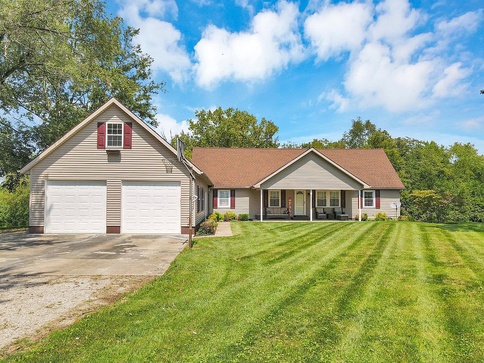 This one of a kind ranch home features over 1,400 sq. ft., 3 bedrooms, and 2 full bathrooms. Remodeled kitchen w/ breakfast bar, ample countertop space, granite counters, and newer appliances. Flowing right in to the formal dining area, perfect for hosting family or friends. The spacious family room is adorned w/ a gas log fireplace, creating a cozy ambiance. Brand new owner's suite full bath. This home is nestled in on almost a full wooded acre. Captivating backyard deck with a full walk-out basement, ready to be finished to meet your needs. 24x40 attached garage w/ 9' 4'' ceiling including plumbing rough in, and additional space upstairs ready to be finished. Don't miss the chance to experience the perfect blend of indoor and outdoor living this residence has to offer. See A2A remarks.