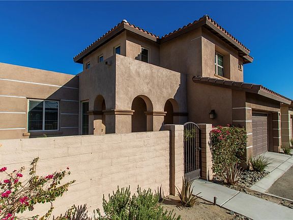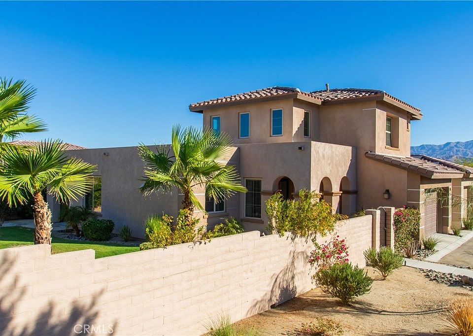 MAIN LEVEL LUXURIOUS PRIMARY SUITE! This pristine home offers modern living at its finest with a spacious, open floor plan that’s perfect for entertaining. The kitchen boasts stainless steel appliances, plentiful cabinetry, sleek granite countertops, and a large island with a breakfast bar, all seamlessly flowing into the dining and cozy living areas. Designer style tile flooring in public spaces, and newer flooring installed in the bedrooms and staircase. recessed lighting, and abundance of natural light throughout. Retreat to the main level primary suite, featuring a spa-like bathroom complete with an oversized walk-in shower, dual sink vanity, and private restroom. Upstairs offers a LOFT, two bedrooms with Jack and Jill bathroom. Additional highlights include an expansive BEAUTIFULLY LANDSCAPED lot that provides ample space for a private pool. Enjoy the community amenities including a fitness center, pool and spa, outdoor BBQ areas, dog parks, and scenic walking paths, all Conveniently located near schools, shopping areas, the new Acrisure Arena, the I-10 freeway and approx. 20 mins away from Palm Springs Airport. *** LOW HOA & YOU OWN THE LAND! ***