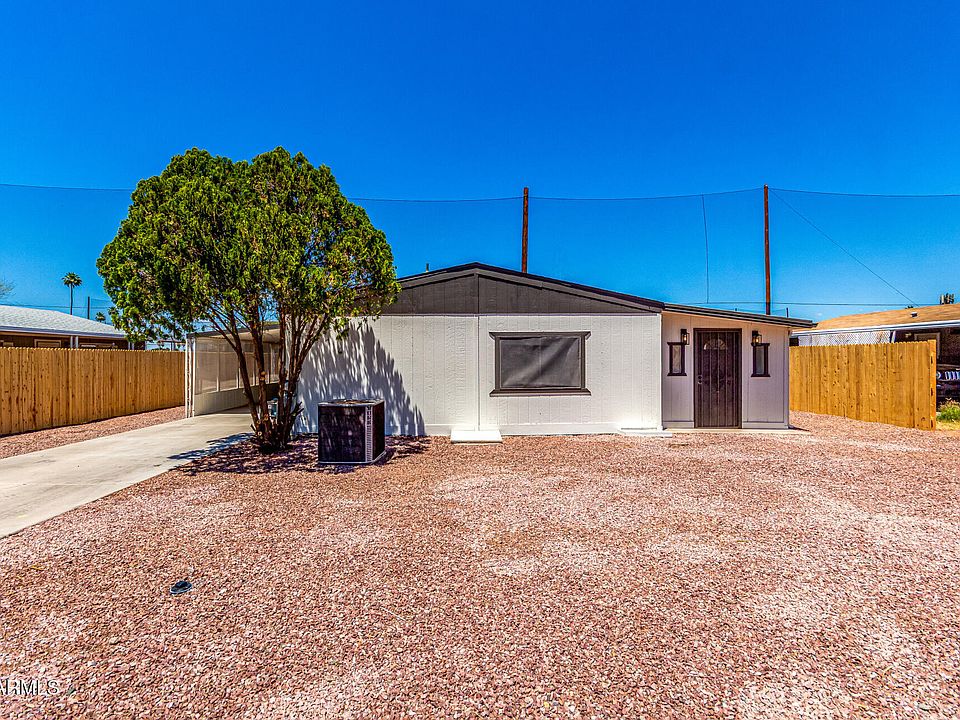 A charming 4 bed, 2 bath property in Desert Sands is now for sale! Located right next to the Community's lush golf course & featuring an easy-care yard plus carport parking, it's sure to be the home for you! Discover an open floor plan w/elegant wood-look flooring and neutral palette throughout. The kitchen comes equipped w/everything you'll need for home cooking, shaekr cabinetry, quartz counters, stainless steel appliances, and an island w/a breakfast bar. Relax & unwind in the primary bedroom, boasting a private ensuite for added comfort. You'll also find a cozy AZ room where you can enjoy quality time w/friends & loved ones! Also including a large backyard w/a screened-in covered patio and a convenient storage shed, this home is a true gem! Don't miss out!