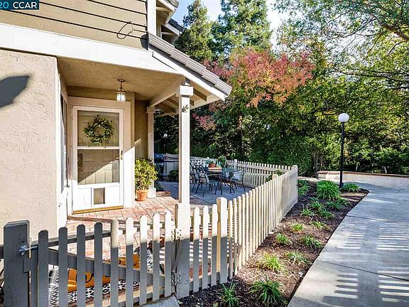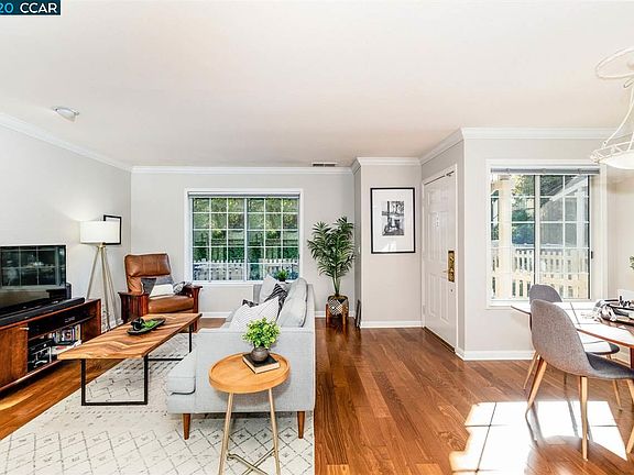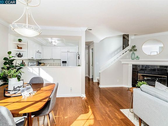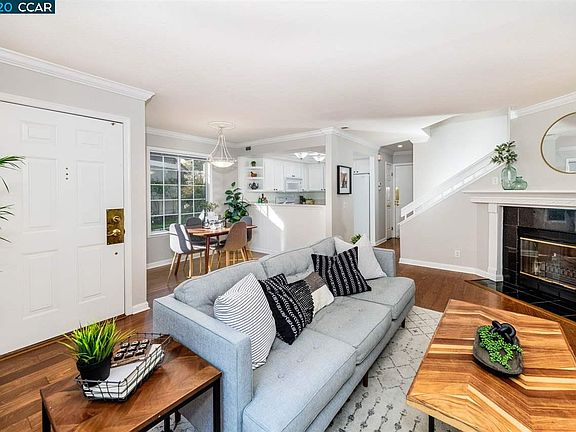 Spacious & bright 2 bedroom + retreat, 2.5 bath end unit w/ 2 car garage. Quiet, private setting with welcoming front entry & spacious patio. Ideal floorplan with "great room" on main floor & 2 bedroom suites plus loft upstairs. Kitchen overlooks dining & family rooms with laminate flooring, crown molding and electric fireplace with decorative mantle. Oversized primary suite boasts vaulted ceilings, walk-in closet & inviting retreat. Loft w/ Skylight makes a great office, zoom room or workout area. Featuring newer interior paint & lush carpet. Dual pane windows, central heat & A/C and garage with storage, laundry hook-ups & sink. Easy access to Alamo Creek Park, trails, shops, commuter roads and Bart. Creekside location - one of the best in the complex!
