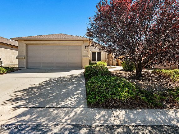 This charming Viewpoint home is move-in ready and offers exceptional curb appeal, enhanced by rosemary and juniper bushes and a large, shaded cherry tree. A winding concrete walkway leads from the driveway to a welcoming bright blue front door, complete with an additional security screen door. Inside, natural Arizona sunshine illuminates the open-concept kitchen, living, and dining rooms, featuring ceilings over 14+ feet high and pleaded shades on each window. A cozy gas fireplace and a high bar-style seating area create a perfect setting for family gatherings and entertaining. This home boasts a split floor plan with three bedrooms, each equipped with ceiling fans. It also includes a separate laundry room and abundant storage closets throughout. The primary bedroom provides direct access to a shaded patio. The bathroom is a true retreat, featuring a garden tub, a glass shower, dual vanities, built-in cabinets, and a spacious walk-in closet. The generous two-car garage has been recently painted and includes large cabinets for optimal storage and organization. A security screen door leads to a private backyard, a blank canvas ready for your creative touch. Its terraced landscaping, topped with mature trees, offers both privacy and shade. Owning a piece of Viewpoint in Prescott Valley is within reach. I invite you to tour this home today; you'll be pleasantly surprised and ready to submit an offer.