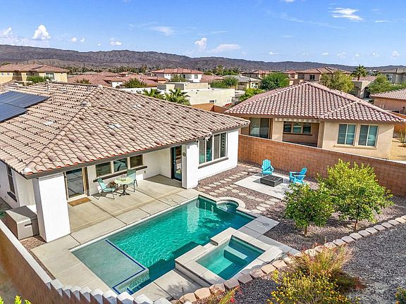 Welcome to Genesis in Palm Desert where outdoor and indoor living come together! This desired open floor plan has 9' ceilings throughout. Recent updates and improvements include all new 5'' baseboards, full exterior and interior paint, new lighting throughout the home, new kitchen Quartz counter tops and back splash, new kitchen sink faucet and garbage disposal, new bedroom and patio ceiling fans, a variable speed internet controlled pool pump, Google Nest Thermostat, Ring Doorbell, Internet enabled keyless door lock, a fully automated timed drip irrigation for citrus trees and plants and timed outdoor landscape lighting. The outdoor area has a west/south facing pool and spa with ample room to relax and sunbathe in those winter months. It also has 9.72kw PAID SOLAR and a tankless hot water heater! This sought-out open floor plan connecting the Great Room, Kitchen, and formal Dining Room makes the home perfect for guest entertainment. The Genesis community features a clubhouse, pool/spa, doggie parks, and greenbelts for strolling. This centrally located home is convenient to shops, restaurants, golf, freeways, casinos, theaters and parks!