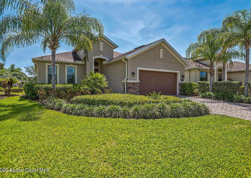 Beautifully finished 3-bedroom, 2-bath home with a dedicated office (optional 4th bedroom) on a premium lakefront lot. Gourmet kitchen with espresso cabinetry, granite counters, stainless appliances, breakfast bar, and pantry. Soaring ceilings, 8' doors, pendant lighting, plantation shutters, and remote-controlled slider shutters. Enjoy tranquil water views from your private backyard retreat. HOA includes full lawn care so you can enjoy resort-style amenities: two pools, tennis/pickleball, clubhouse, playgrounds, parks, and miles of trails. Golf-cart friendly and moments to The Avenue Viera, dining, shopping, and top-rated schools. Schedule your private showing today!