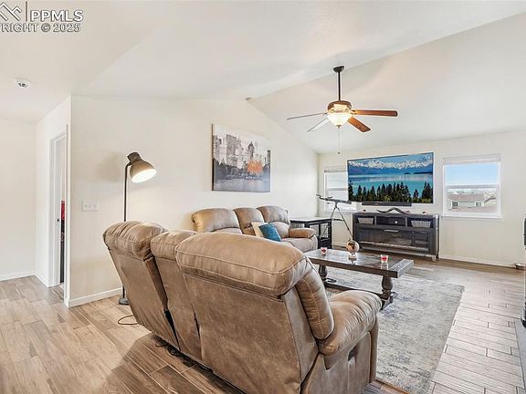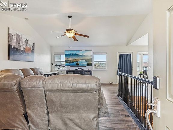 This home provides magnificent views of the Front Range and the legendary Pikes Peak, creating a tranquil and scenic setting. The chef's dream kitchen boasts a wealth of cabinetry, a handy lazy Susan, and contemporary appliances such as a dishwasher, microwave, refrigerator, and smooth-top range. This inviting area is made more functional and charming by a roomy pantry, a cozy eating nook that walks out onto a newly permitted Trex deck (installed in 2022). The spacious great room features high vaulted ceilings, resulting in a luminous and airy ambiance. The master suite serves as a genuine sanctuary, featuring a walk-in closet and an opulent five-piece bathroom that ensures maximum comfort and convenience. To ensure there is sufficient living space, two additional well-furnished bedrooms are situated on the main level. The completely finished basement includes a spacious family room and two extra bedrooms, perfect for guests or a developing family. A walk-out basement opens up to a spacious, secluded patio that features a fire pit—ideal for outdoor gatherings and unwinding. Other features include a laundry room with washer and dryer, central air conditioning, custom window treatments, a beautifully landscaped flat yard, and a two-car garage with built-in shelves for additional storage. With its superb design and practical living areas, this residence provides an ideal mix of opulence and coziness.