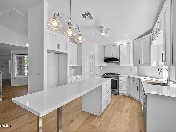 This beautifully remodeled 3-bed + den, 2.5-bath home showcases modern style, comfort, and exceptional craftsmanship in every detail. Step inside to discover a stunning new glass and steel stair railing, all-new hardwood laminate and tile flooring, upgraded baseboards and door trim, new blinds, ceiling fans, and designer light fixtures throughout. Newer interior and exterior paint complete the home's like-new feel. The chef-inspired kitchen has been fully reimagined with sleek quartz countertops, an extended island, additional custom cabinetry, and brand-new SS appliances - perfect for cooking, entertaining, and everyday living. Relax in the inviting living room featuring new built-in glass shelving with spotlights, custom cabinetry, and an elegant electric fireplace re-tiled in marble.. Every bathroom has been completely renovated with new tile, quartz countertops, modern vanities, updated faucets, and toilets, along with beautifully refreshed showers and tubs. The den now includes a closet, offering added flexibility and storage space. Additional upgrades include a new water heater and water softener (2024) and a new roof (2019), providing years of comfort and peace of mind. Step outside to enjoy thoughtful exterior improvements such as a new fountain, updated irrigation lines, citrus trees, vines, and a shaded patio cover - perfect for relaxing or entertaining outdoors. Every inch of this home has been thoughtfully updated, offering true move-in readiness and a level of quality rarely found today!