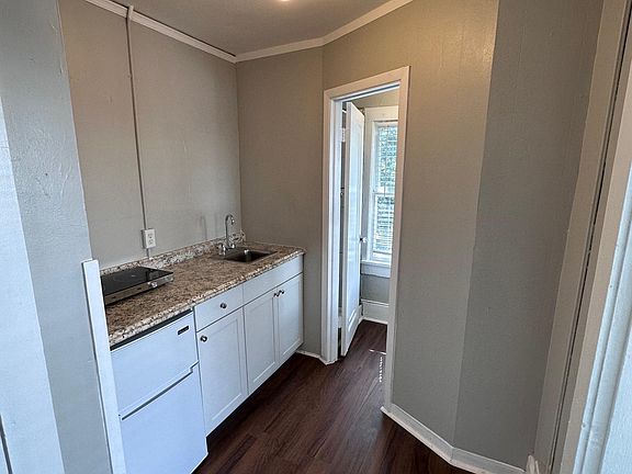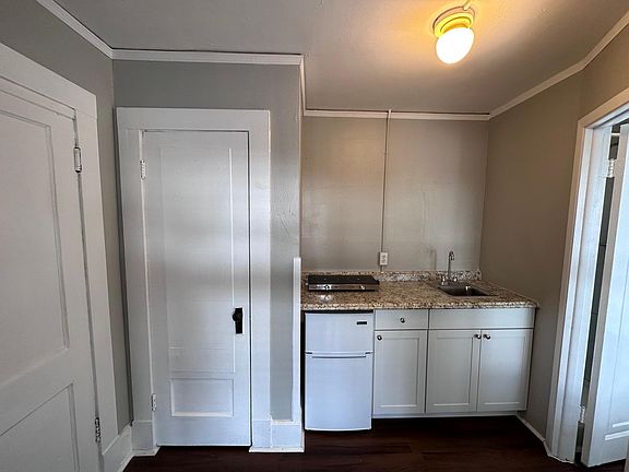 The unit boasts fresh grey paint with white base boards and all new vinyl flooring. The kitchnette has new white cabinets, a 2 burner cooktop and small dorm size fridge as well as a granite countertop.