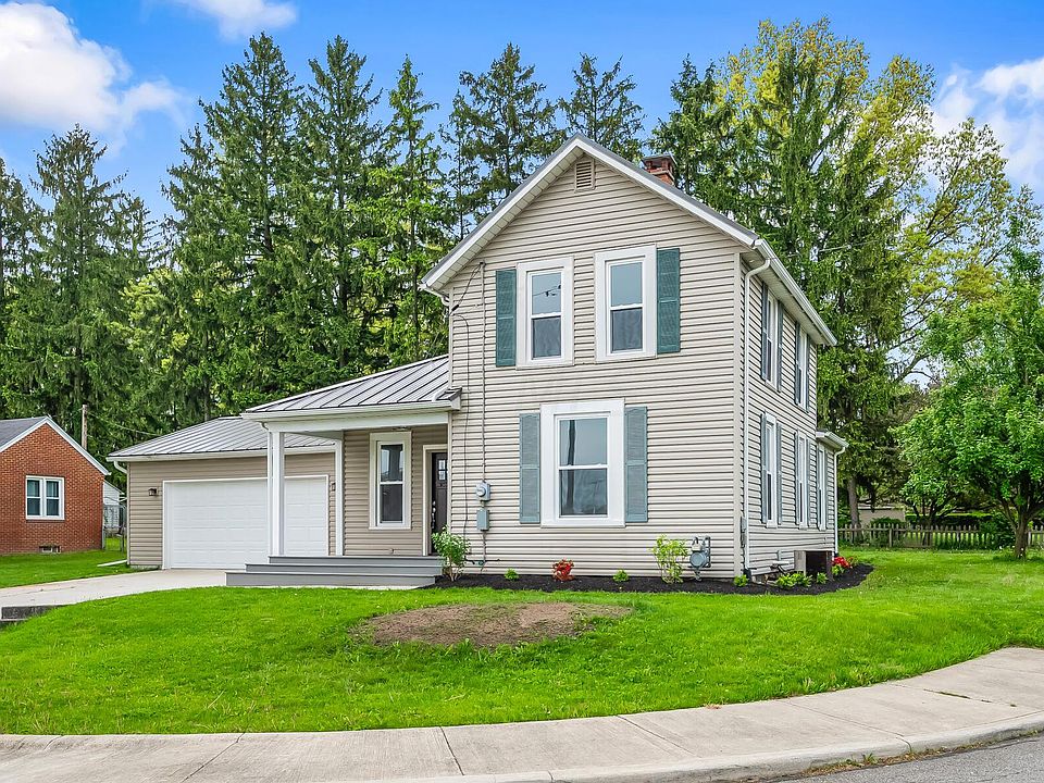 Welcome home to this stunning, newly remodeled gem nestled on a corner lot in Galion. With major updates already taken care of, including a new metal roof, windows, and a charming front porch, this home exudes both style and functionality. Step inside to discover beautiful wood floors leading you to the desirable kitchen, boasting all-new cabinets, solid surface countertops, tile backsplash &stainless steel appliances. The convenience of a first-floor master bedroom with a fully renovated ensuite and a laundry room featuring ample cabinet space adds to the home's appeal. Upstairs, you'll find nicely sized bedrooms perfect for family or guests. Outside, the spacious yard and large patio beckon for outdoor gatherings. Completing this home is a two-car garage and a concrete driveway.