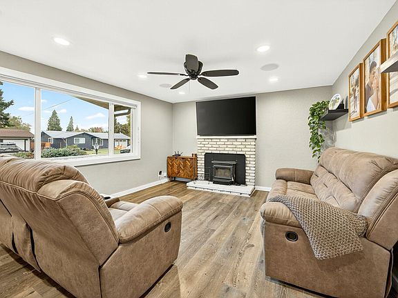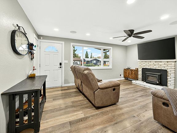 Enter into this beautifully maintained single-level home, where comfort and functionality meet. The spacious living room features a cozy wood-burning fireplace, built-in speakers, picture windows, and durable vinyl luxury flooring. The light-filled galley kitchen boasts tile flooring, a newer range/oven, and seamless access to the adjacent dining area, which opens through sliding doors to an oversized backyard oasis. The remodeled bathroom offers a fresh, modern feel with a newer tub/shower insert, updated vanity, and fresh paint. Additional highlights include a heated single-car attached garage, RV parking with electrical hookups, and two large, detached sheds for extra storage or workspace. The fully fenced backyard is a gardener's dream, complete with a concrete-covered patio, above-ground sprinklers, fresh bark, and ample space to grow and gather.