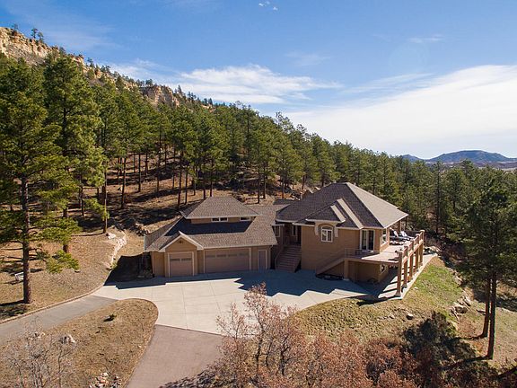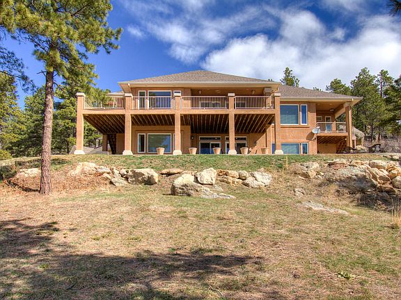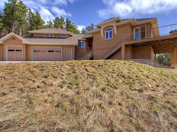 Gorgeous Custom Ranch with Finished Lower Level Walkout features VIEWS that are second to NONE and are truly what makes this property spectacular. With nearly 4800 feet of impeccably maintained and beautifully finished space this home offers 5 bedrooms, 6 bathrooms, 2 family rooms and 2 kitchens. Nearly every room gives breathtaking views of the mountains and valleys that surround it. The lower level has been finished to offer a fully functional space separate from the main floor to accommodate guests. So whether you decide to take a hike up to the top of Spruce Mountain, relax on the large low maintenance deck to soak up the sun, sit around the gas powered fire pit to roast marshmallows while enjoying fireworks over Palmer lake, or you kick back in front of the fireplace on a snowy day and take in the scenery through the big windows and large sliding doors, this home will have you living like it's vacation everyday.Granite countertops throughout the house in kitchens and baths. Beautifully tiled showers with frameless glass doors on the lower level showers. The home has been wired for 5.1 surround sound in upper and lower level family rooms, including speakers in the master bedroom and bathroom, study and all outside decks, front and back. The lower level has been keyed and equipped with coded security locks to allow for separate living space if desired. This includes washer\dryer hook ups in the mechanical room and a separate furnace. Dual 50gal water heaters installed in sequence to ensure plenty of hot water for both levels. Water provided by a community well serviced by the Dawson Aquifer provides excellent water quality. Well is maintained by the HOA. An available gas hookup on the back of the house for gas grill hook up etc. A 20kw Generac whole house backup generator is included in the sale.