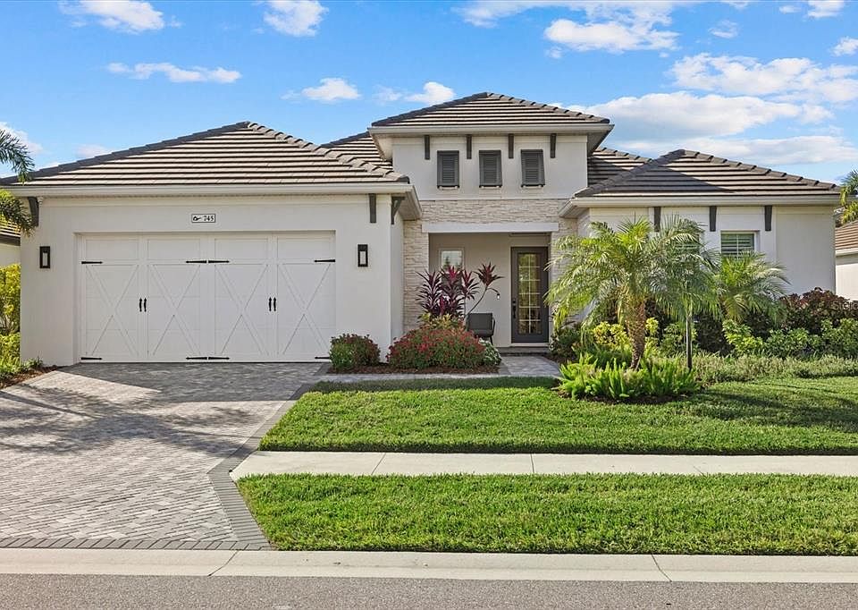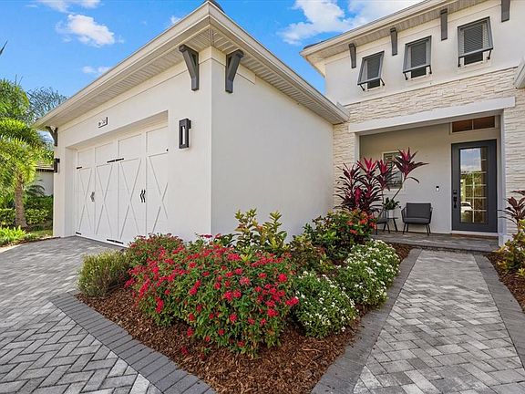 Set on a serene preserve lot in the highly sought-after LakeHouse Cove at Waterside, this home defines livable luxury. Built in 2022 by Homes by Towne, this thoughtfully designed residence offers 5 bedrooms and 3 full bathrooms—all on one level. Upon entering, you're greeted by soaring ceilings and an abundance of natural light that fills the home. Stunning wood-like tile seamlessly extends throughout, enhancing the exquisite finishes chosen for this coastal contemporary home, which embodies the elegant yet relaxed lifestyle you have envisioned. The gourmet kitchen is perfectly designed for entertaining, boasting dual oversized islands with seating, quartz countertops, luxury appliances, a gas cooktop, and a generous walk-in pantry. The great room stuns with 16-foot vaulted ceilings, a custom display shelf crafted with wood imported from Ecuador, and hurricane-grade glass sliders that open effortlessly to an outdoor oasis. The outdoor living area exudes luxury with its sophisticated covered entertaining space, heated saltwater pool, and jewel-toned glass-tiled spa set on natural stone pavers—an exquisite setting for enjoying breathtaking sunsets. The owner’s retreat is a peaceful sanctuary offering his-and-her walk-in closets and elegant tray ceilings. The adjoining primary bath offers a spa-style shower and separate vanities. Four additional guest suites—each with walk-in closets and nearby full bathrooms—provide comfort and privacy for family and visitors alike. For peace of mind, this home features impact windows and a security system with cameras. The three-car garage is equipped with epoxy flooring and an EV charger. Other noteworthy features include: a mudroom, large laundry room with sink, side-yard fence, upgraded lighting, plantation shutters, and more. LakeHouse Cove is a fully equipped lifestyle community offering resort-style amenities including a state-of-the-art gym, clubhouse, playground, pickleball courts, social activities, a pool and spa overlooking a lake, and a boathouse with kayak storage. From the boathouse, you can hop on the water taxi to Waterside Place – Lakewood Ranch’s newest town center and the only waterfront retail and lifestyle destination in Sarasota. HOA includes landscaping.