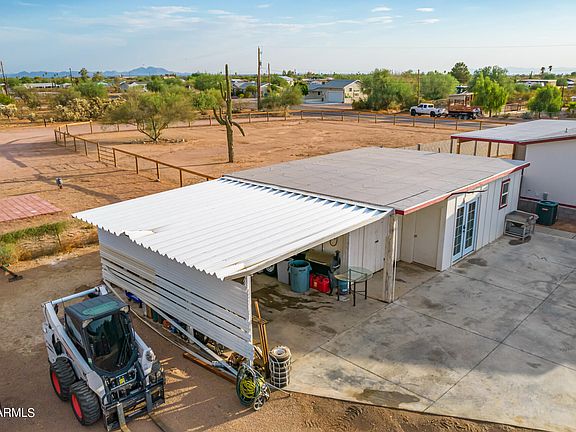This spectacular property has unbelievable mountain views & it's a Horse Lovers' Paradise! Need to work from home? There is a separate, detached 20 x 20 office that has insulated walls as well as AC & Heat!! This home is connected to city SEWER & there is NO hauled water & NO well water! The water is provided by AZ water company. Situated on a corner lot w/ NO HOA, two RV gates & parking! This 3 bed/2 bath home features a large full length front porch! Inside is inviting w/ light & bright paint colors. The modern wood-like laminate flooring is easy to maintain. The interior layout features a split floor plan w/ vaulted ceilings. There are 7 well-maintained horse stalls w/Misters & Solar lights. Bring your RV & other toys! This home features a RV hookup w/ water & electric connections Back on market because buyer wasn't able to obtain loan. The kitchen features abundant cabinets, dishwasher & breakfast bar. The property is thoughtfully fenced w/ separate dog run to keep your pets separated from the rest of the yard. Two separate gated entrances provide easy access for all your toys, making it a breeze to maneuver trailers, boats & more. This lot is completely usable & flat, there is still plenty of room to build & expand according to your desires. The home comes with newer AC & roof. This home in an unbeatable location w/ amazing mountain views & spacious lot, the horse stalls & workshop for your passion projects. You will love having easy freeway access, all the riding trails & Rodeo grounds near by! You could easily ride your horses to the Goldfield Ghost Town. The property is also close to lakes, the river and ATV trails for lots of outdoor fun! Don't miss out on the opportunity to own this dream property!